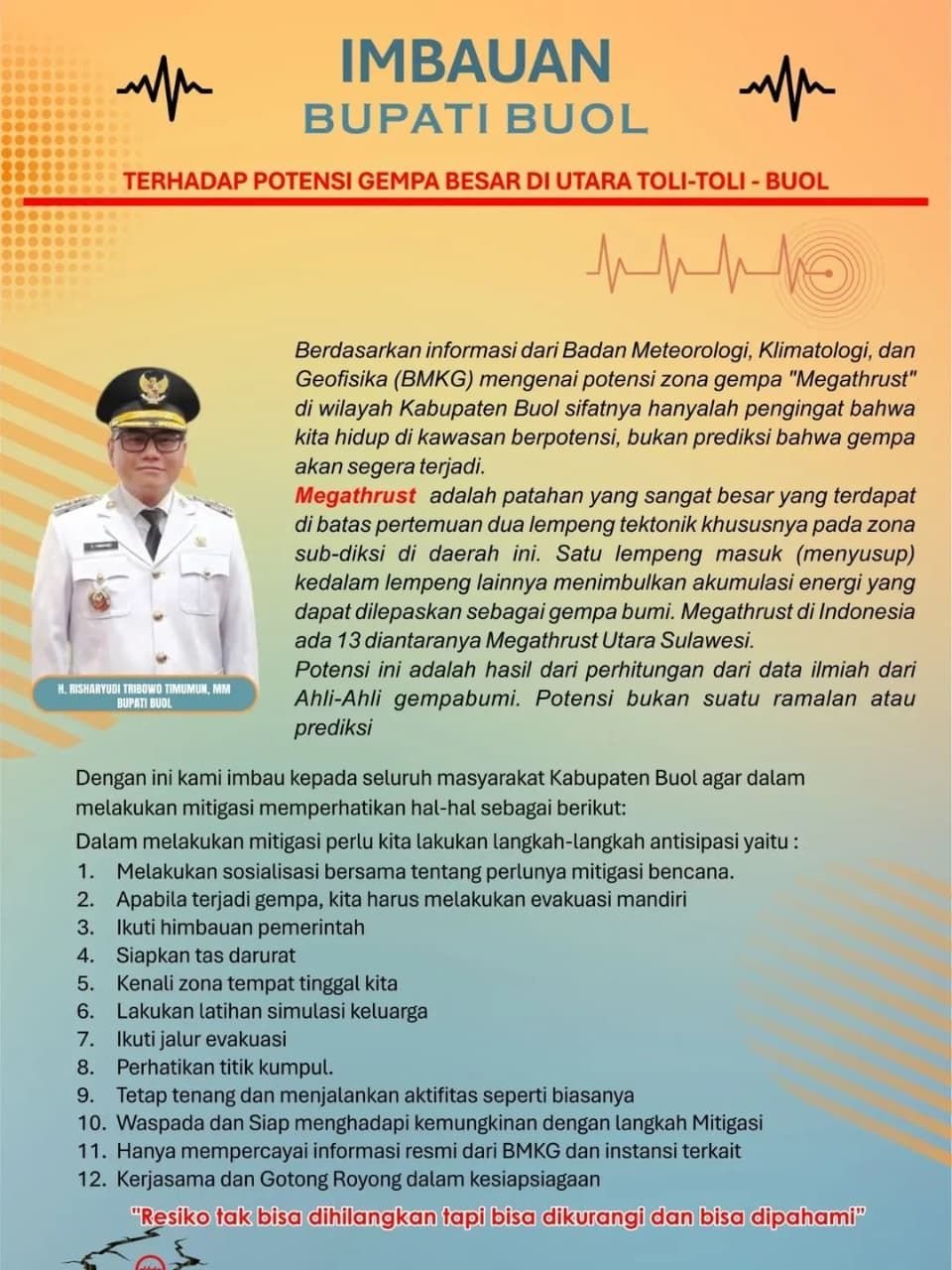 Buol — Pemerintah Kabupaten Buol mengimbau seluruh masyarakat untuk meningkatkan kesiapsiagaan terhadap potensi gempa besar pada zona Megathrust di wilayah utara Toli-Toli hingga Buol. Imbauan ini disampaikan Bupati Buol menindaklanjuti informasi resmi dari Badan Meteorologi, Klimatologi, dan Geofisika (BMKG).